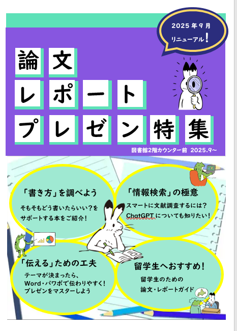 はじめてのレポート作成から卒論作成まで、最新のお役立ち本を集めています! ぜひご活用ください ▶開催場所:図書館2階 カウンター前(「北海道関係図書コーナー」そば) ▶展示期間:2025年9月~ ↓展示リスト一覧 お知らせ